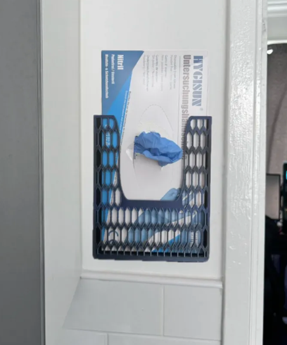 Slitesterk og praktisk veggfeste til engangshansker – perfekt for garasjen, verkstedet, hjemmetjenesten eller vaskerommet.
