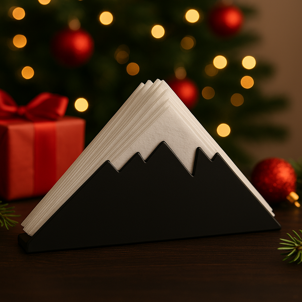 Denne stilrene serviettholderen er 3D-printet i matt PLA og formet som et fjellmassiv – et design som kombinerer funksjon og estetikk.